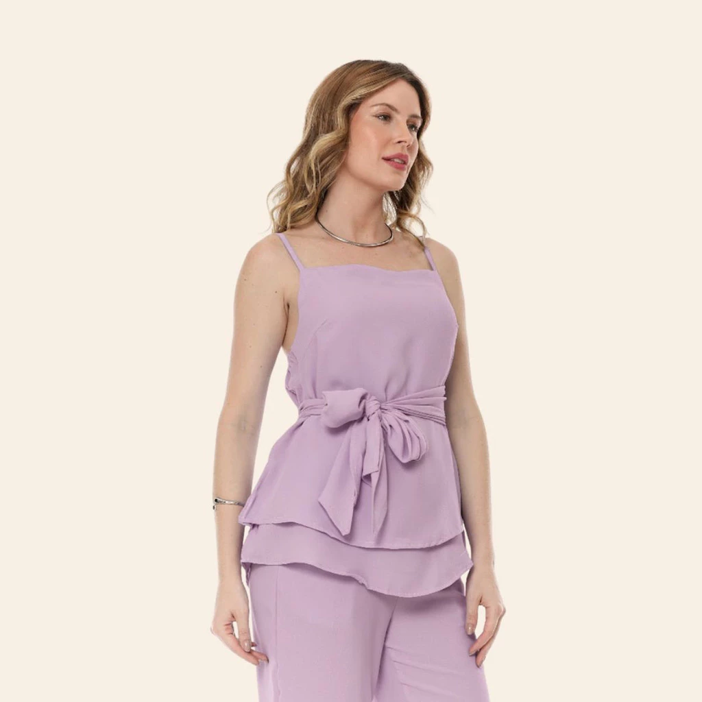 O laço traz charme e suavidade ao conjunto, enquanto a pantalona alonga a silhueta e transmite sofisticação. Um visual social que se destaca com naturalidade.