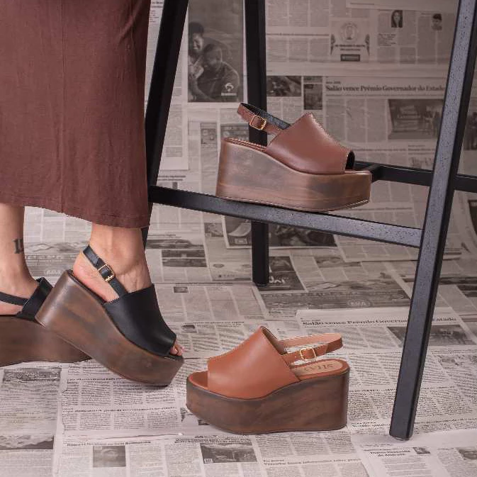 A plataforma com efeito madeira traz personalidade e sofisticação ao look, enquanto o design feminino valoriza o visual com leveza e bom gosto.