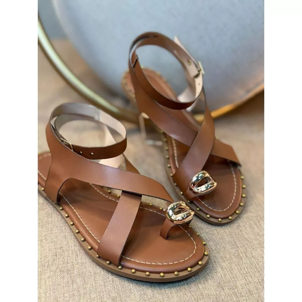 A proposta luxo aparece nos detalhes e no acabamento, criando uma imagem feminina e bem-resolvida. Uma rasteira que valoriza o look sem exageros, com sofisticação discreta.